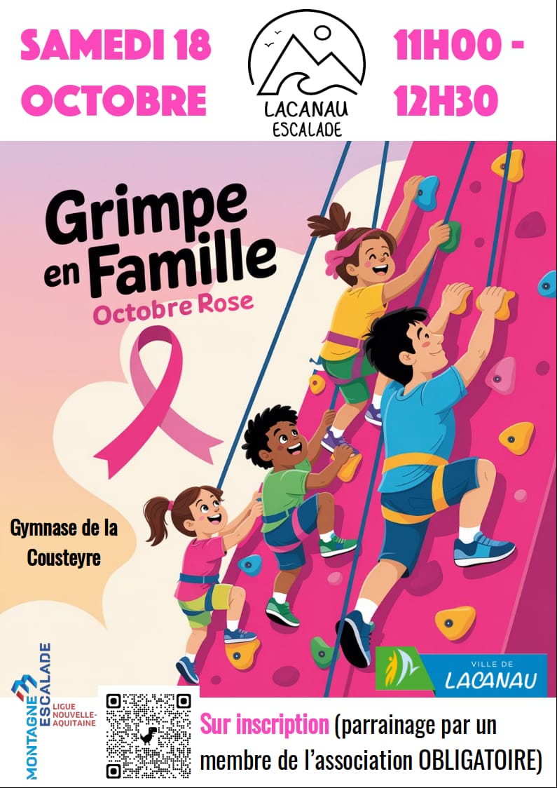 En partenariat avec la Ville de Lacanau, lâassociation Lacanau Escalade est heureuse de vous inviter Ă une session spĂ©ciale Grimpe en Famille pour cĂ©lĂ©brer Octobre Rose ! Venez profiter dâun moment convivial, sportif et solidaire, oĂč petits et grands pourront grimper ensemble dans une ambiance chaleureuse.